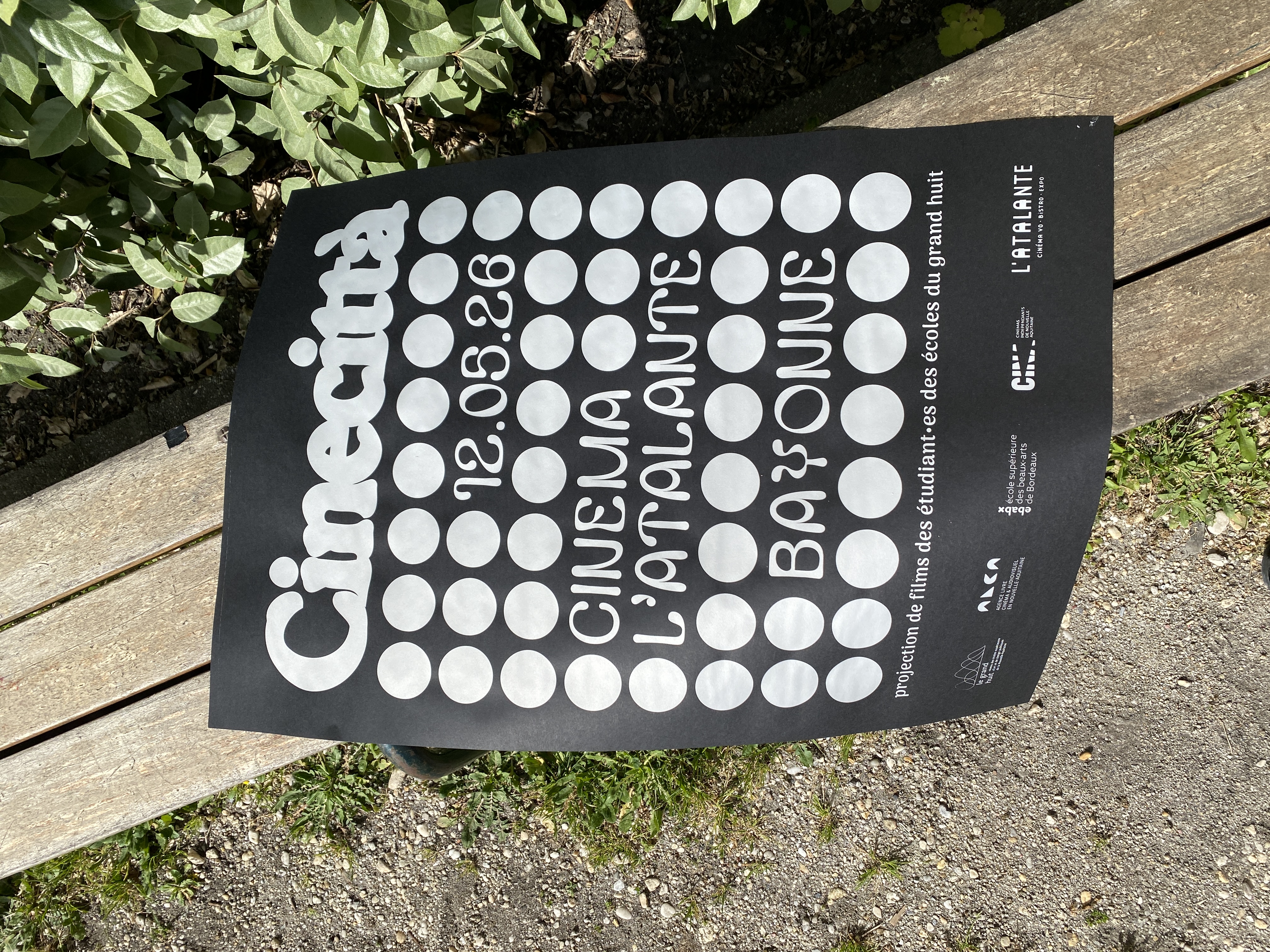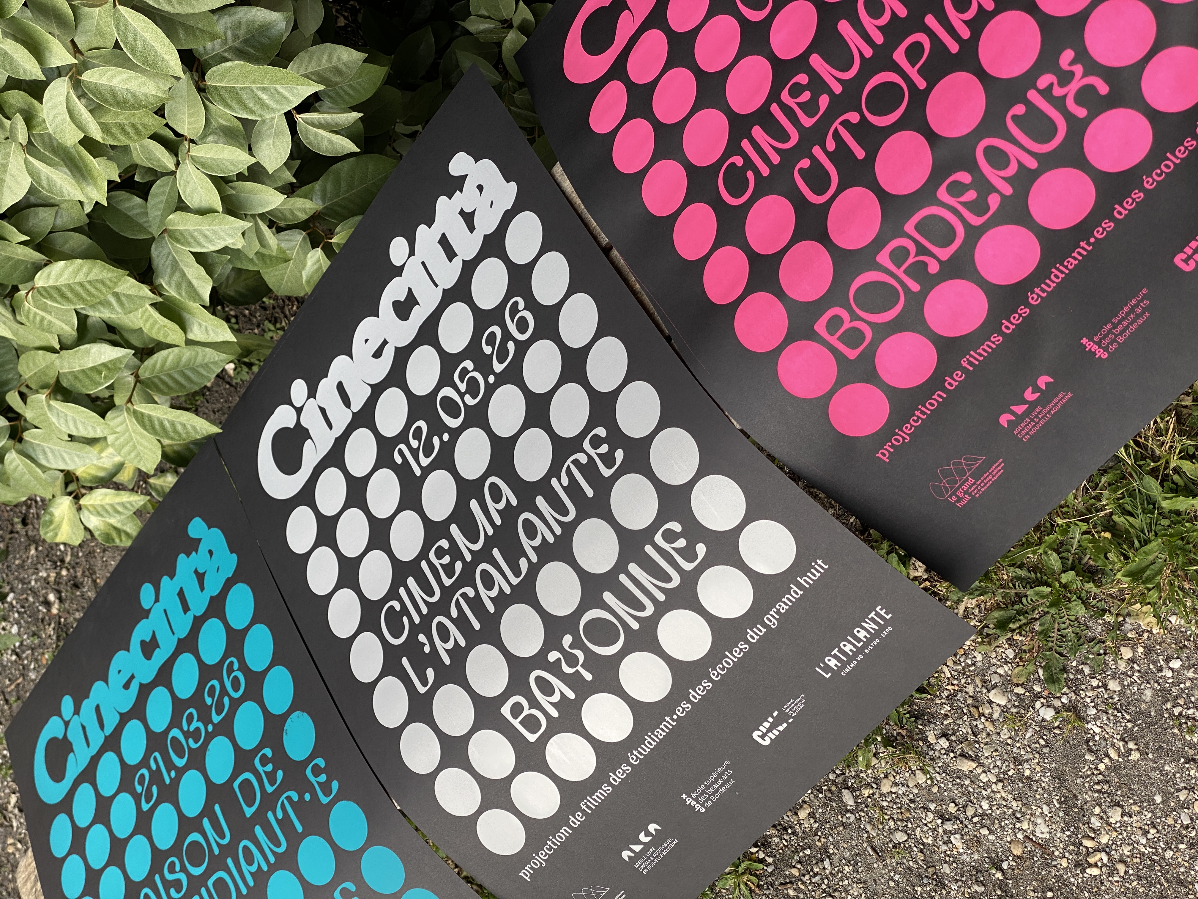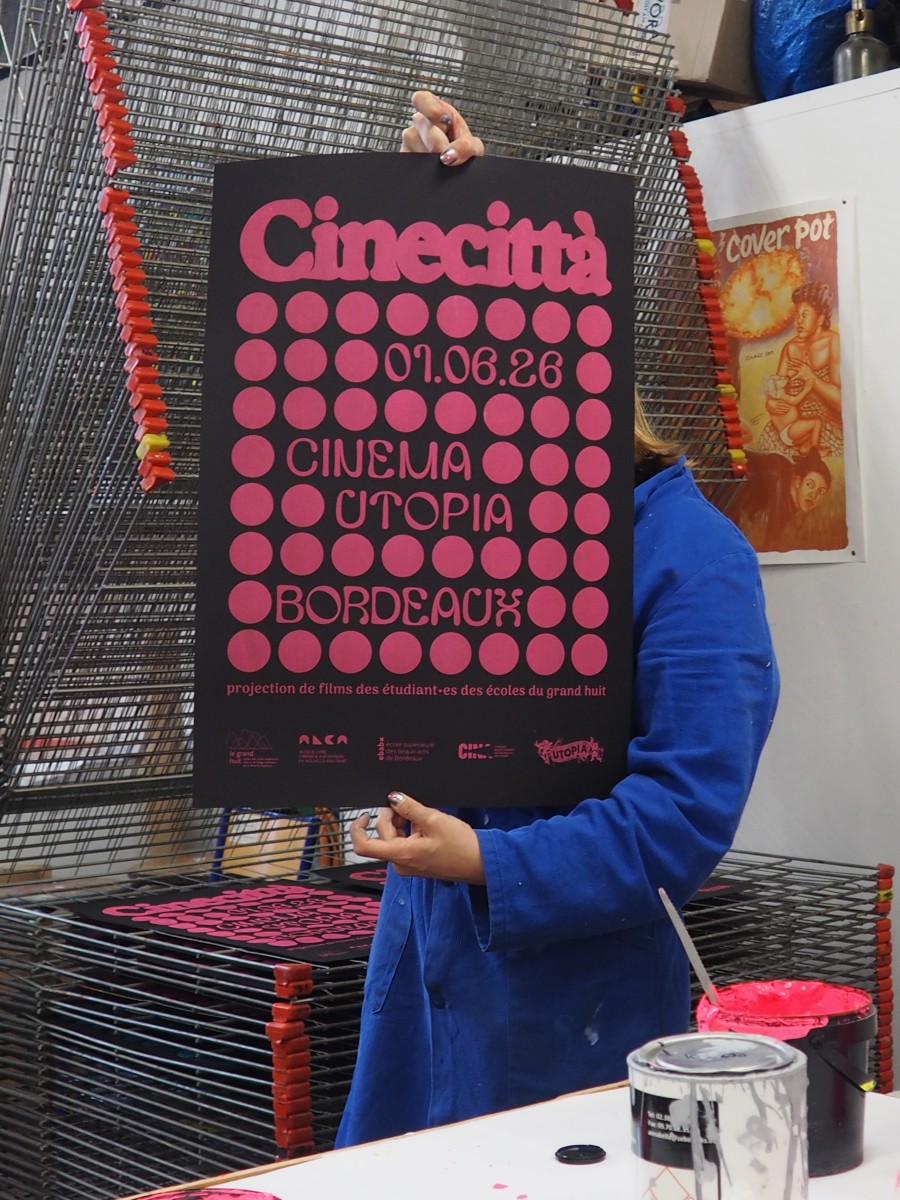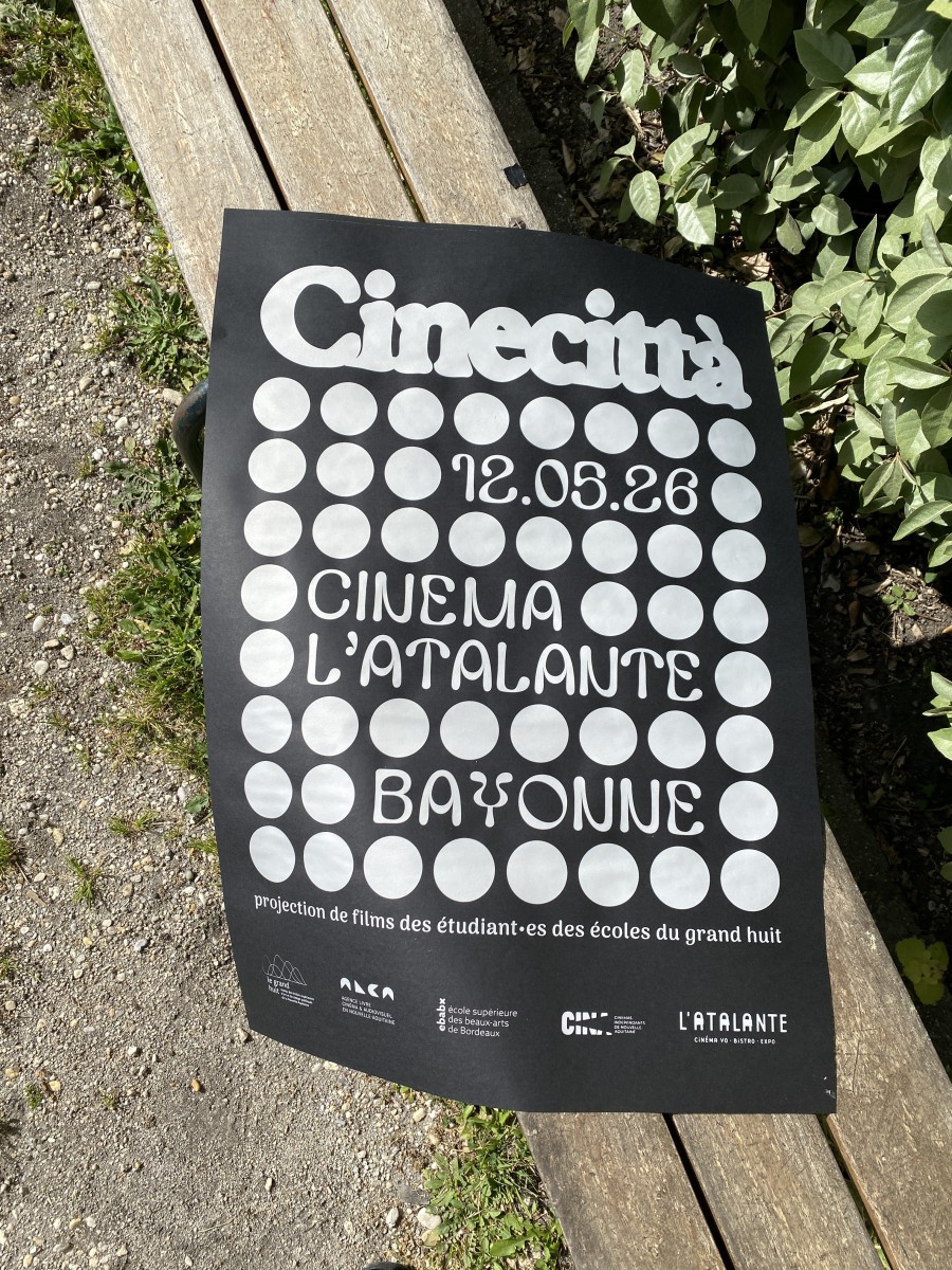 Cette affiche s’articule autour d’une idée de trame dans la trame où une grille de points structure l’image telle une matrice visuelle. Dans cette régularité apparente, chaque cercle possède sa propre densité. Ces variations illustrent la diversité des regards : chaque point est une présence, un point de vue singulier, un cadrage. Comme dans une salle de cinéma, l’expérience est commune, mais la perception restent intimes. Ce dispositif graphique renvoie également au langage cinématographique, où le récit contient souvent d’autres récits : des références, des citations, des mises en abyme. Le nom Cinecittà s’impose avec une typographie généreuse. Il agit comme l’écran vers lequel tous les regards convergent. Tandis que la trame de points figure l’attente du public dans la pénombre ou l’œil des auteurs derrière l’objectif, le lettrage devient l’événement : le film qui s’apprête à démarrer.