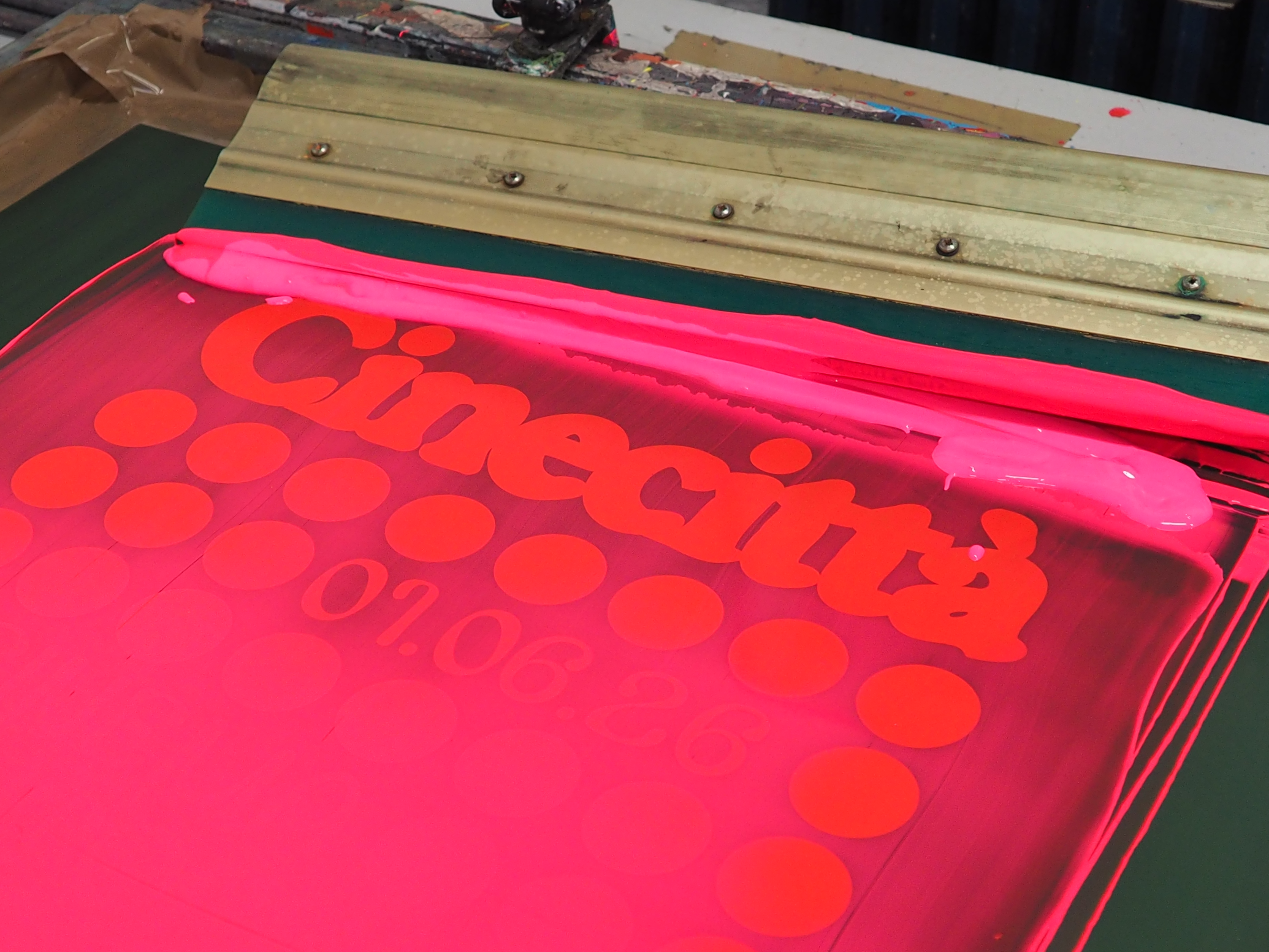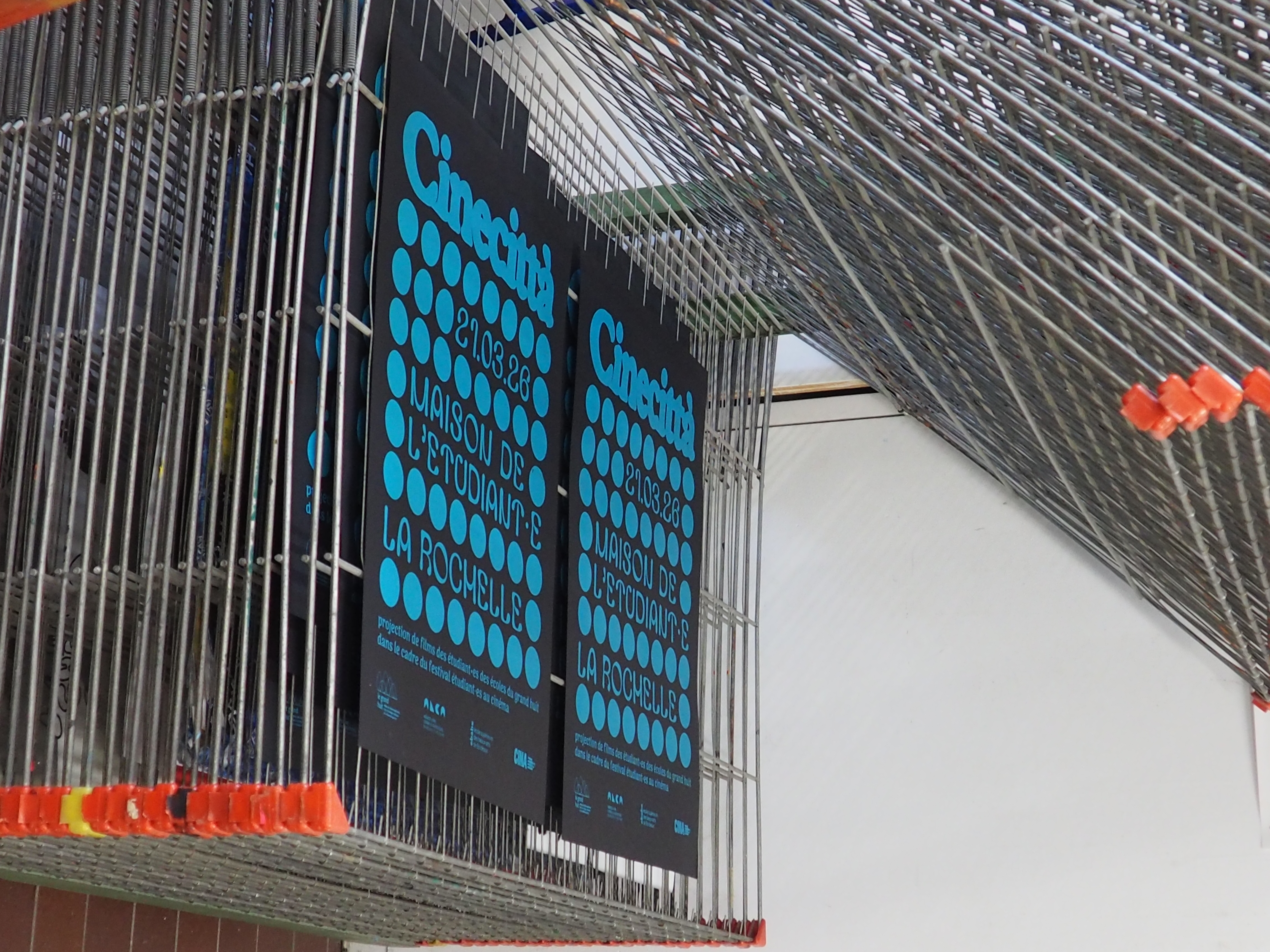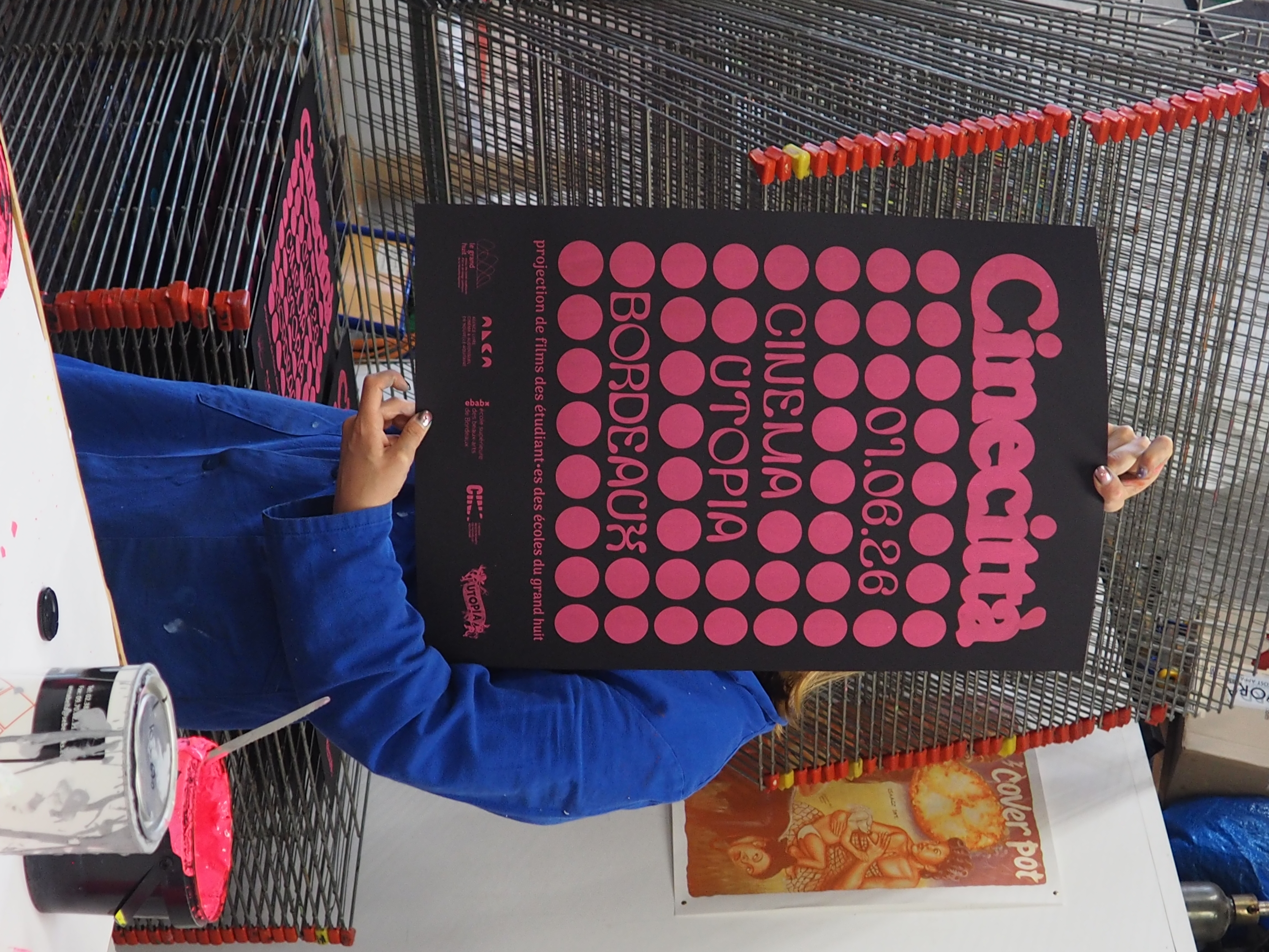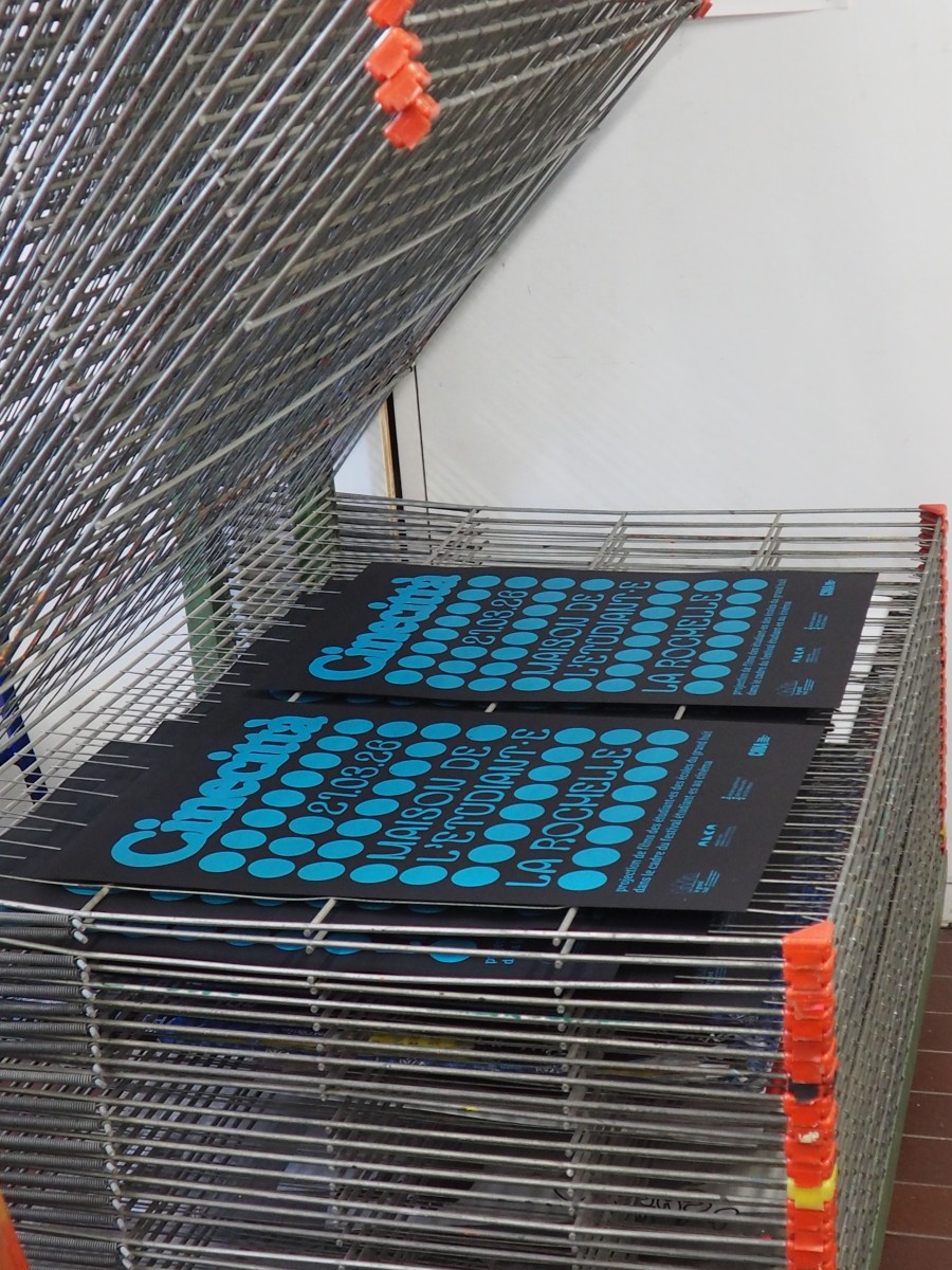 Cette affiche s’articule autour d’une idée de trame dans la trame où une grille de points structure l’image telle une matrice visuelle. Dans cette régularité apparente, chaque cercle possède sa propre densité. Ces variations illustrent la diversité des regards : chaque point est une présence, un point de vue singulier, un cadrage. Comme dans une salle de cinéma, l’expérience est commune, mais la perception restent intimes. Ce dispositif graphique renvoie également au langage cinématographique, où le récit contient souvent d’autres récits : des références, des citations, des mises en abyme. Le nom Cinecittà s’impose avec une typographie généreuse. Il agit comme l’écran vers lequel tous les regards convergent. Tandis que la trame de points figure l’attente du public dans la pénombre ou l’œil des auteurs derrière l’objectif, le lettrage devient l’événement : le film qui s’apprête à démarrer.