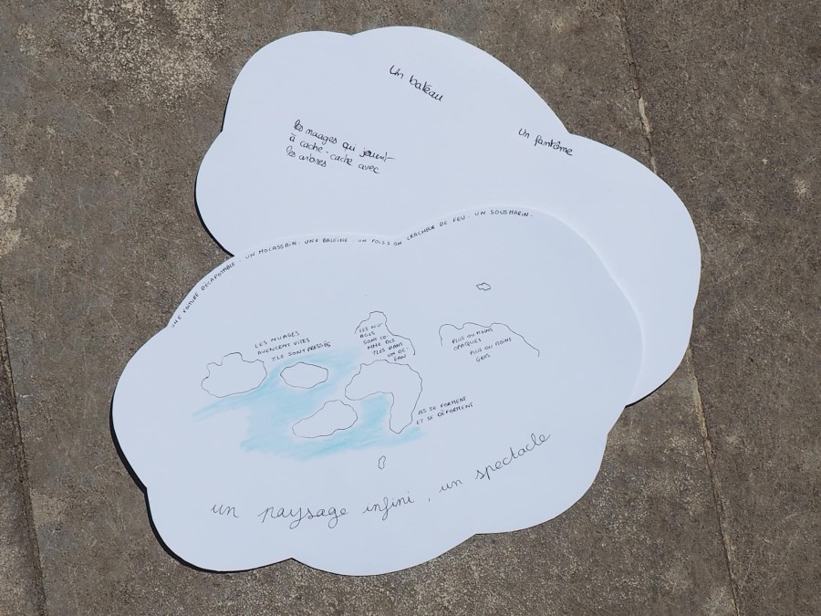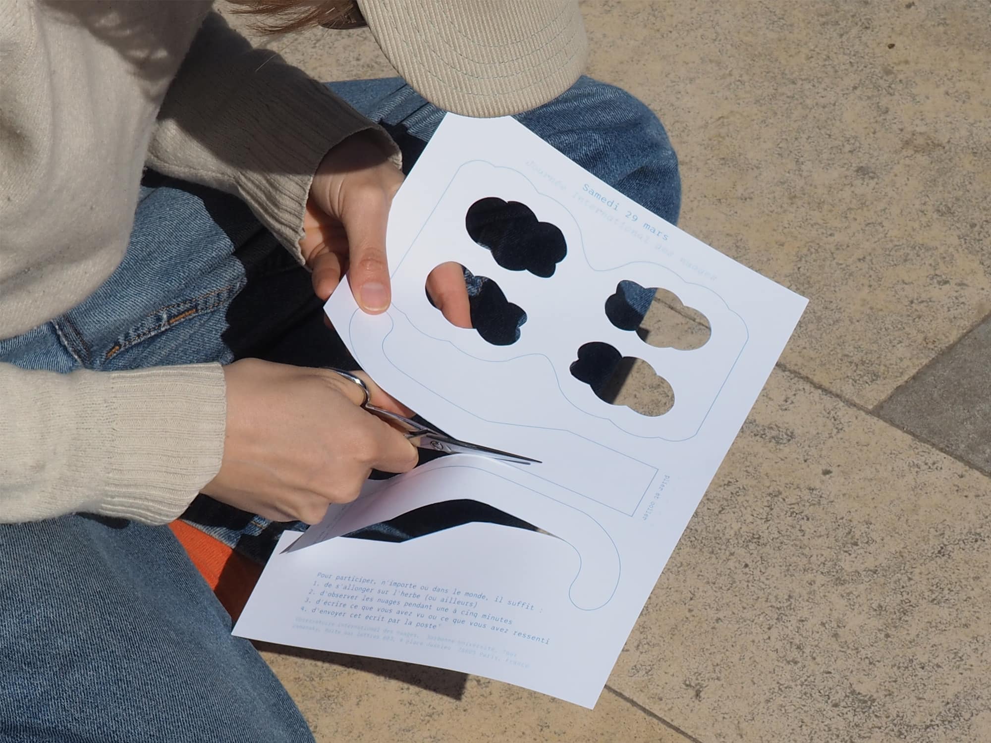 L’invitation est à la fois physique et réflexive : s’allonger, observer, puis transcrire l’impalpable au verso de l’objet. Une fois complété, le nuage de papier rejoint une archive collective, transformant un acte individuel en un geste politique global.