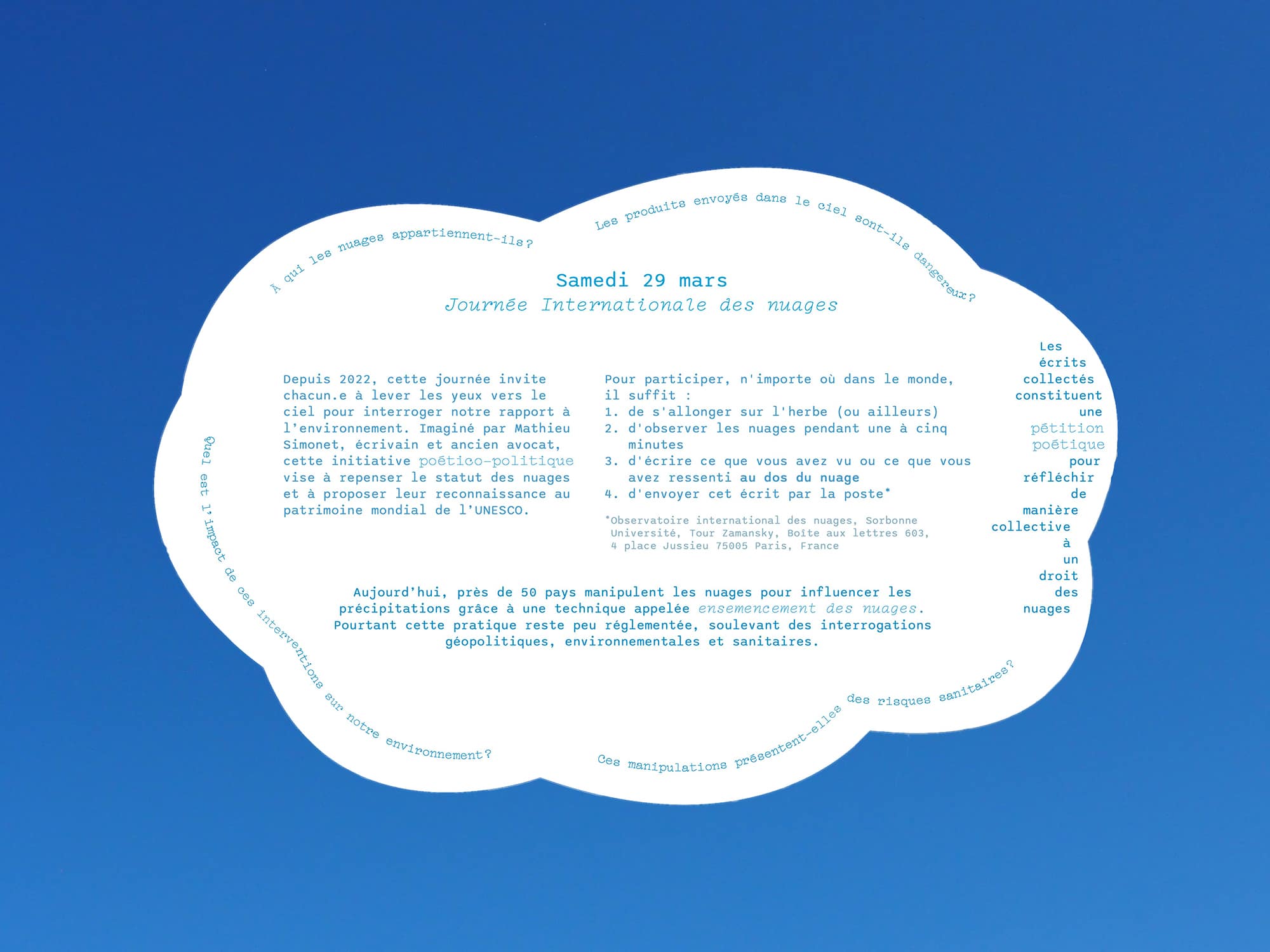 Conçu comme une interface entre le spectateur et l’éther, le flyer nuage à la forme organique rompt avec les formats standards. Il ne se contente pas de transmettre une information sur l’ensemencement des nuages ; il devient le support d’une pétition poétique.